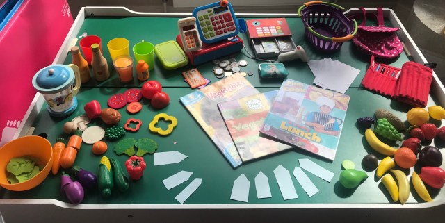 Using role play is lots of fun, they do learn about fruit and veg, but this can be used for other simple learning opportunities for our little ones.