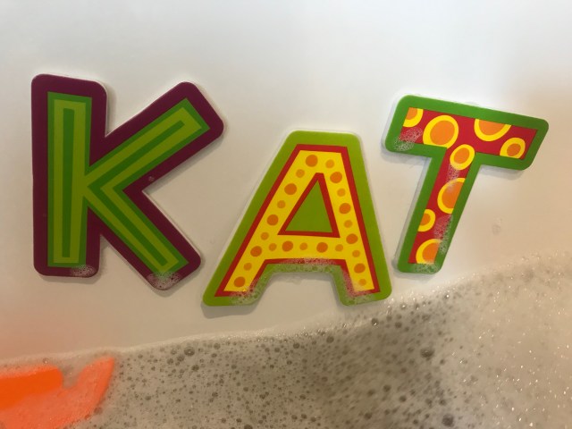 You can buy letters and number toys that stick to the side of the bath. We used to make words from the letters or pick out a number and match the ducks. It always reminded me of the soup in that children’s tv show that was on.