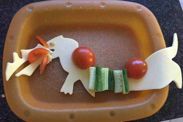 I made the dragon from a dog cutter and got a little creative, using cucumber for the body and tomatoes for the fire.
