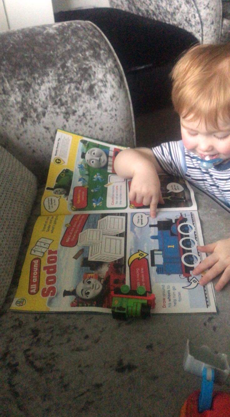 Max Chadwick, Haslingden (aged 22 months) looking at a Thomas the Tank Engine Magazine