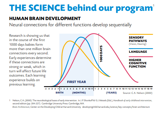 The challenge is, though the brain is developing at a rate that will never be replicated again in our life, babies spend the most time with their parents who are learning how to be parents for the first time and have little or no training on child development.