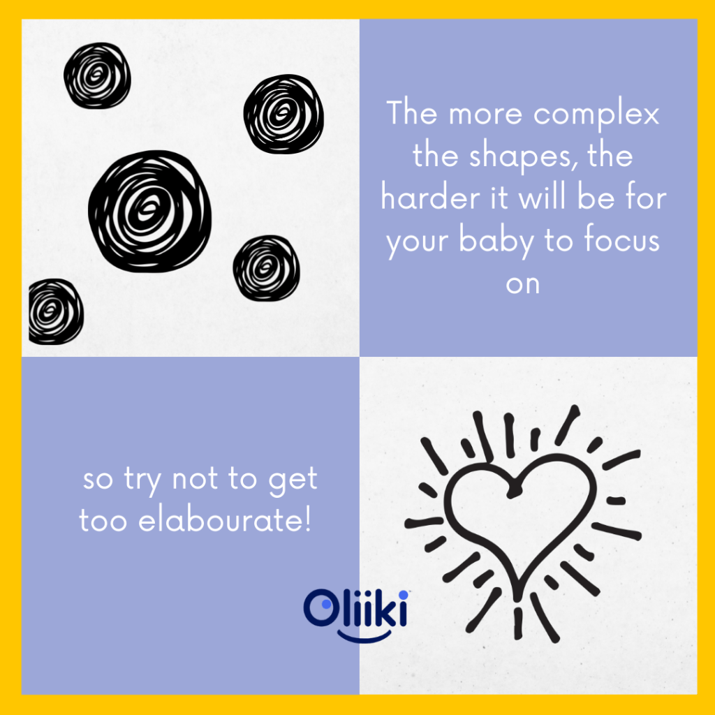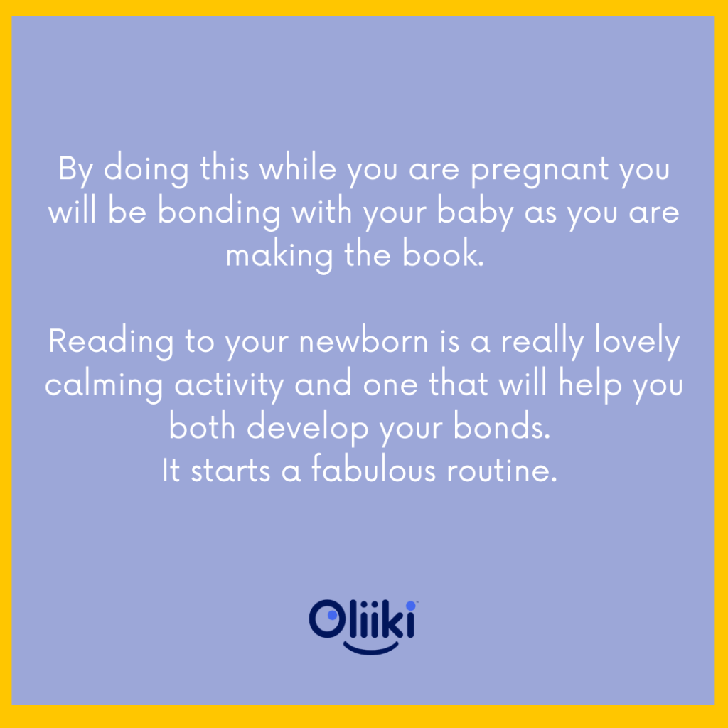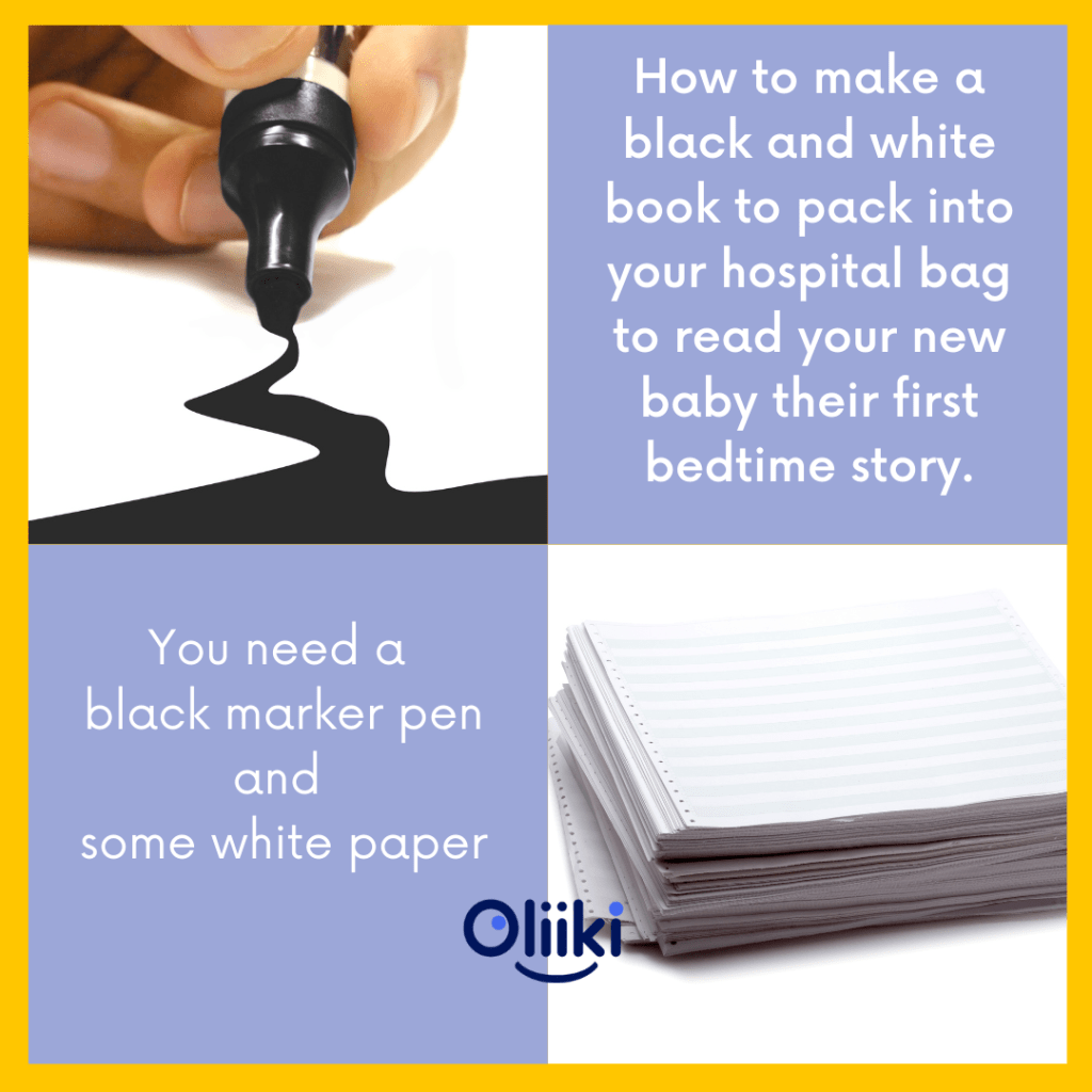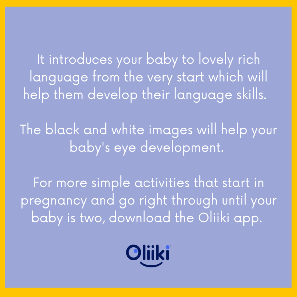 I advise my pregnant parents to spend time reading every day, it helps them relax which is brilliant for baby, but if they read out loud, it’s fabulous for brain building too. As an activity (from the Oliiki Baby Brain Building App) I suggest that parents make their baby their first black and white book!