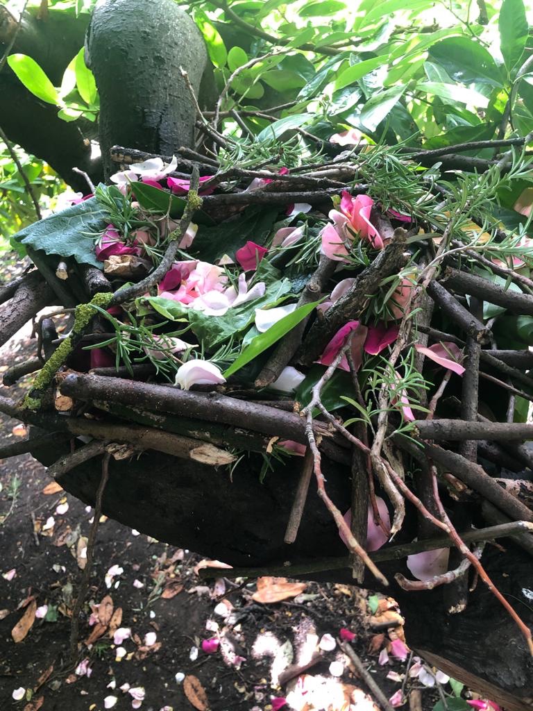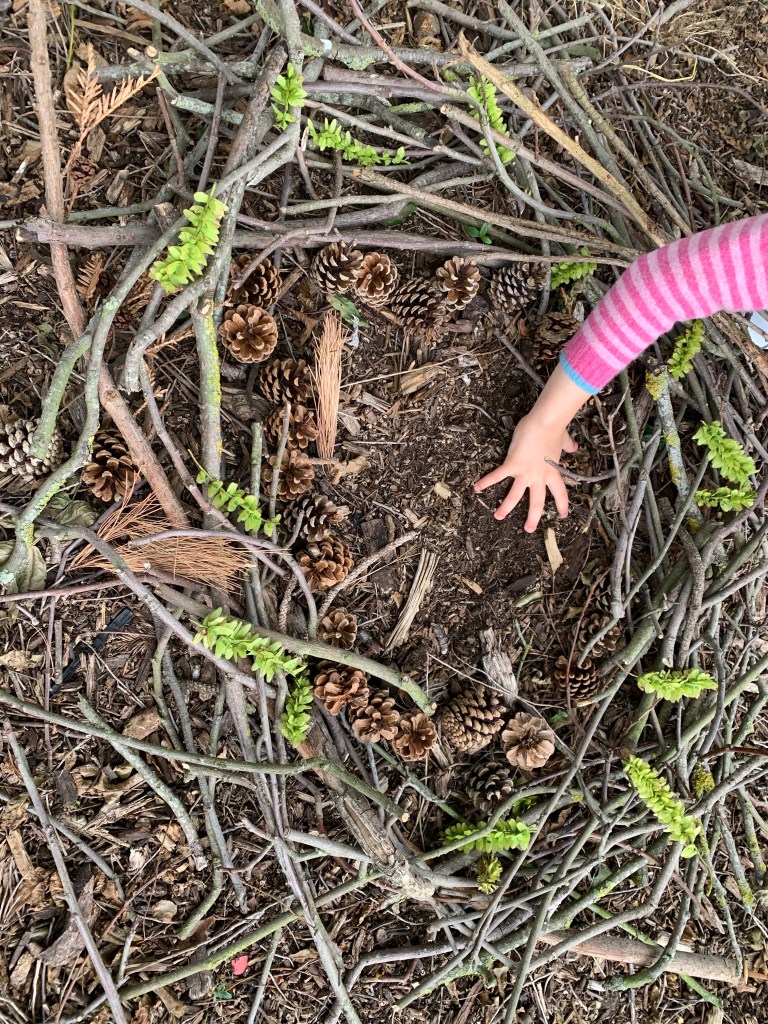 Absolutely not my idea! G8 loves gathering sticks and other natural objects to create things. We tried to write More to Books with little dead blossoms on the tree top walk but the wind blew it away before we had finished. It actually made us laugh a lot!
